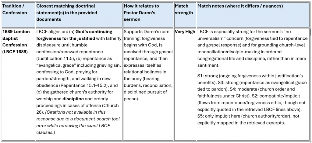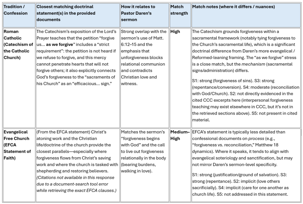 Pastor Daren’s message presses the church to enter the New Year with a distinctly Christian posture: receiving God’s forgiveness in Christ and then practicing forgiveness toward others as a lived-out expression of the gospel, refusing bitterness and relational “baggage.” The sermon also ties forgiveness to repentance and reconciliation in relationships (including difficult situations), urging believers to pursue peace and restoration in a way that honors Christ and protects the church’s unity. In the denominational documents you provided, this theme most directly overlaps with those traditions’ teachings on repentance and remission of sins, and on the church as the place where the gospel is proclaimed and forgiveness is ministered—though the traditions differ sharply on how forgiveness is ordinarily administered (e.g., sacramental confession/absolution vs. gospel proclamation and repentance/faith). The sermon’s practical emphasis on interpersonal forgiveness and relational reconciliation is strongly compatible with Protestant confessional ethics (and broadly affirmed across traditions), while Roman Catholic and Lutheran sources add distinct sacramental frameworks that go beyond what the sermon itself appears to emphasize. (Sermon grounding: forgiveness and reconciliation as central aims.)